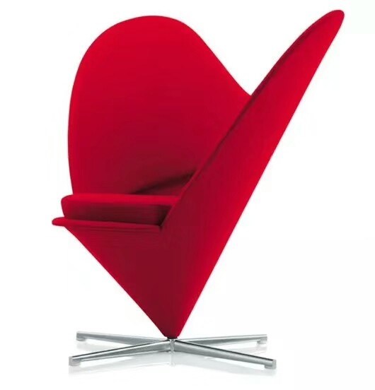 في منتصف عام 1950 ، حولت Verner panton حافلة فولكس واجن إلى استوديو متنقل وسافر عبر أوروبا. في عام 1958 عاد إلى الدنمارك مملوءًا بالأفكار غير التقليدية ... تطورت إحداها إلى كرسي مخروط القلب المبتكر. في تحد للجاذبية ، كان المخروط مستقبلاً وصادماً على حد سواء ... لدرجة أنه عندما تم عرضه في نافذة متجر في مدينة نيويورك ، كان على الشرطة أن تأمر بإزالته بسبب الفوضى المرورية التي خلقت وجودها. كرسي مريح للاستخدام اليومي ، وقد أعادت Vitra بإخلاص إصدار هذا الكلاسيكية بالتعاون الوثيق مع عزبة بانتون. يأخذ The Heart Cone Chair اسمه من صورة ظلية على شكل قلب.